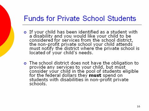Funds for Private School Students. There are funds set aside in each district to support students with disabilities who attend private schools. The district does not have an obligation to provide services specifically to your child, but they must consider your child in the pool of students eligible for those federal dollars they MUST spend on ESE students in private schools.