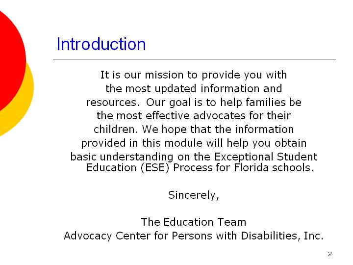 During this training session we will be reviewing the Exceptional Student Education process, also referred to as the ESE process. There are 10 steps in this process that will be discussed in great detail. It is our intention to provide you with strategies and information that will help you be proficient in navigating this process for your child.