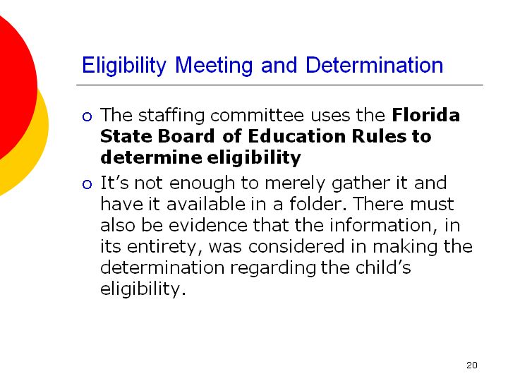 Eligibility Meeting and Determination. Program eligibility is determined by the criteria set forth in the state board of education rules. The team should consider program eligibility in all areas of the child's disability.