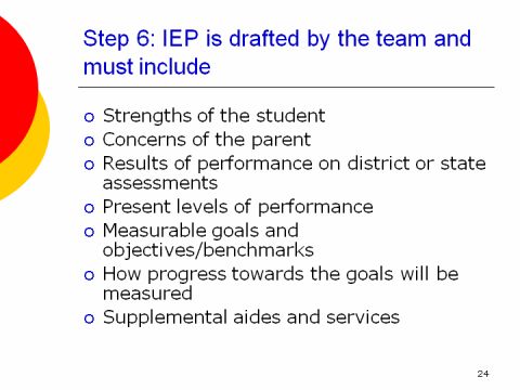 Step 6: IEP is Drafted by the Team and Must Include. There are components of the IEP that are critical for you to understand and become familiar with. These areas are as follows: 1. Strengths of the student: In this section it is important to focus on what your child's abilities are. 2. Concerns of the parent: This is where you can document your concerns for your child. They can be academic concerns and/or behavioral concerns. 3. Results of performance on district or state assessments: This is where your team will document your child's performance on evaluations, district assessments, or state assessments like the FCAT. 4. Present level of performance: This section should capture information about how your child is currently doing in school and how his/her disability affects his or her performance in class. 5. Measurable Goals and Objectives/Benchmarks: Once a child's needs are identified, the IEP team works to develop appropriate goals to address those needs. Annual goals describe what the child is expected to do or learn within a 12-month period. Benchmarks or Short-Term Objectives are required only for children with disabilities who take alternate assessments aligned to alternate achievement standards. 6. How progress towards the goals will be measured: Each child's IEP must also contain a description of how his or her progress toward meeting the annual goals will be measured and when it will be reported to parents. Typically this is reported on a quarterly (nine week) basis, through progress reports and report cards. 7. Supplementary Aids and Services: Supplementary aids and services are intended to improve your child's access to learning and his or her participation across the spectrum of academic, extracurricular, and nonacademic activities and settings. The IEP team must determine what supplementary aids and services your child will need and specify them in the IEP. This is typically where a team would document the need for a 1 to 1 paraprofessional to support your child while he / she is in class.