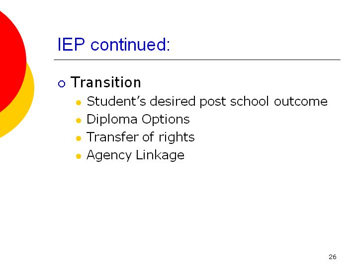 IEP Continued. If your child is 14 years of age, you should be sure to include supports under the area of Transition. This section should discuss your child's post school outcomes, diploma options, transfer of rights which will occur when your child becomes 18 years old, and lastly agency linkage. This is a good opportunity to bring in additional professionals who specialize in transition services and community supports. These individuals are typically knowledgeable in determining post school outcomes, community assistance, employment, and living arrangements. Some agencies to consider are Vocational Rehabilitation or the Agency for Persons with Disabilities (APD).