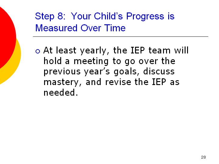 Step 8: Your Child's Progress is Measured Over Time. The IEP should be reviewed yearly. You can have more than one IEP meeting a year, but the districts cannot have less than one meeting in which the team would go over goals and services. This is a good time to determine if your child is meeting the current goals on the IEP and make any additional changes as needed. We suggest that you, the parent, request quarterly meetings with your team to ensure that progress is being met.