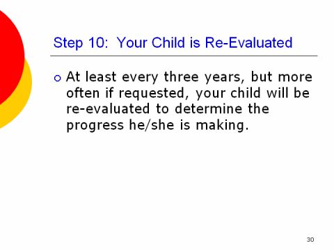 Step 10: Your Child is Re-Evaluated. The district has an obligation to conduct re-evaluations on your child's progress. A child is evaluated every three years in order to determine educational progress.
