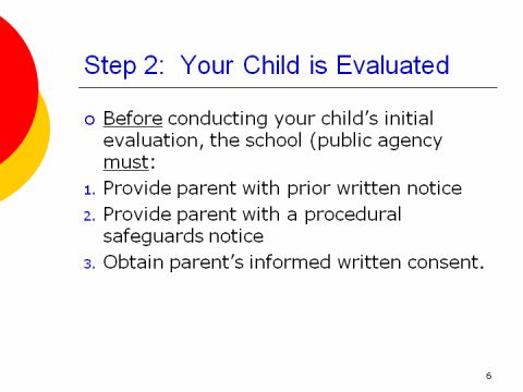 Step 2: Your Child is Evaluated. Your school must do the following prior to any evaluation occurring on your child: 1. Provide you with a prior written notice. This means that the school must notify you in writing if they plan to initiate or change the identification, evaluation, or educational placement of your child or the provision of Free and Appropriate Public Education (FAPE) to your child. 2. Provide you with a copy of your procedural safeguards - this will inform you of your rights and your due process rights should you and the school disagree on the findings of the evaluations 3. Obtain written consent to do an evaluation on your child - The school has to request your permission prior to conducting any evaluations on your child. The consent should indicate which evaluations they plan on conducting on your child.