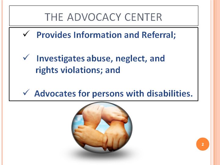 Person Served (PS): So what does the Advocacy Center do? Advocate (A): The Advocacy Center provides information and referral, we investigate some incidents of abuse, neglect, and rights violations and we also advocate for individuals with disabilities.