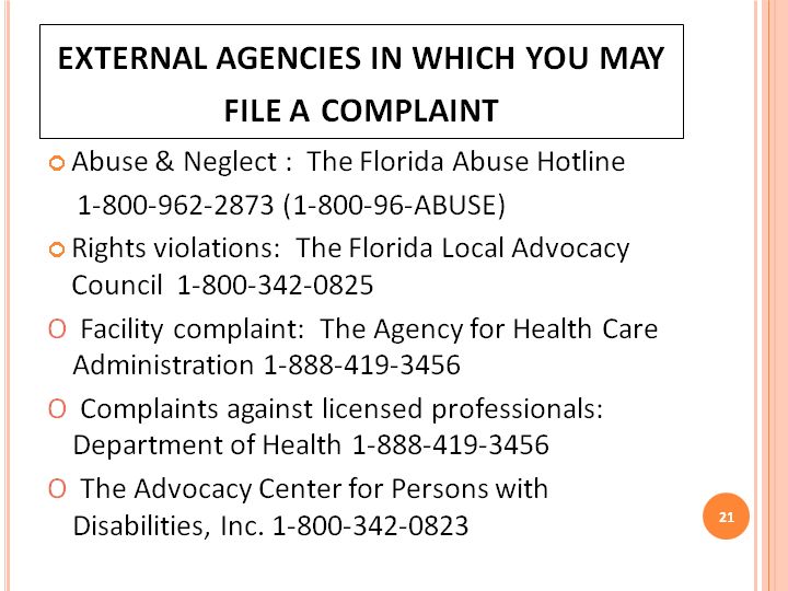 A: There are also other agencies that can help you if you have a complaint? The Florida Abuse Hotline handles abuse and neglect complaints. The Florida Local Advocacy Council is made up of volunteers appointed by the Governor of Florida to investigate complaints against Department of Children and Families provider services. The Agency for Health Care Administration investigates complaints against facilities. The Department of Health takes complaints against licensed professionals such as doctors, nurses, clinical social workers or anyone who is licensed by the State of Florida.